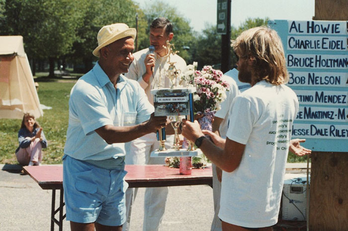Sri Chinmoy presents the first-place trophy to the winner of the Sri Chinmoy 7-Day Race for the second straight year, the great Canadian ultra-distance runner Al Howie, who covered a distance of 530 miles at Flushing Meadows Corona Park in Queens, New York.