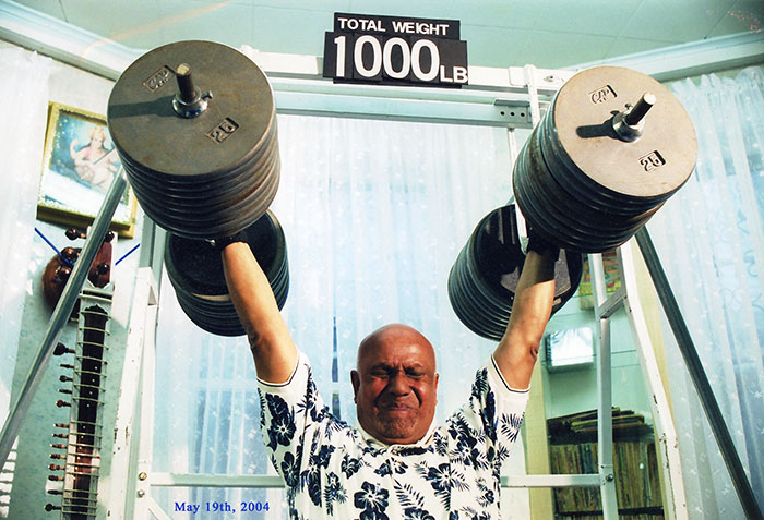 2004 Sri Chinmoy lifts a total weight of 1,000 lbs. with two arms from a seated position, at his home in Jamaica, New York.