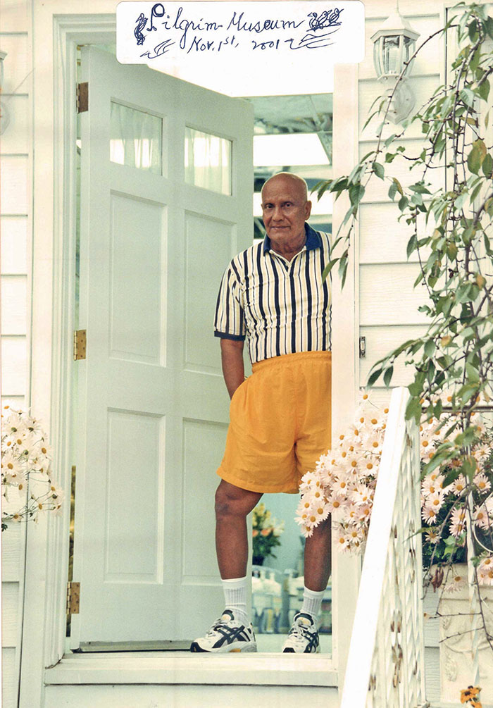 2001 Sri Chinmoy at the door of Pilgrim-Museum, adjacent to Aspiration-Ground in Jamaica, Queens, New York.