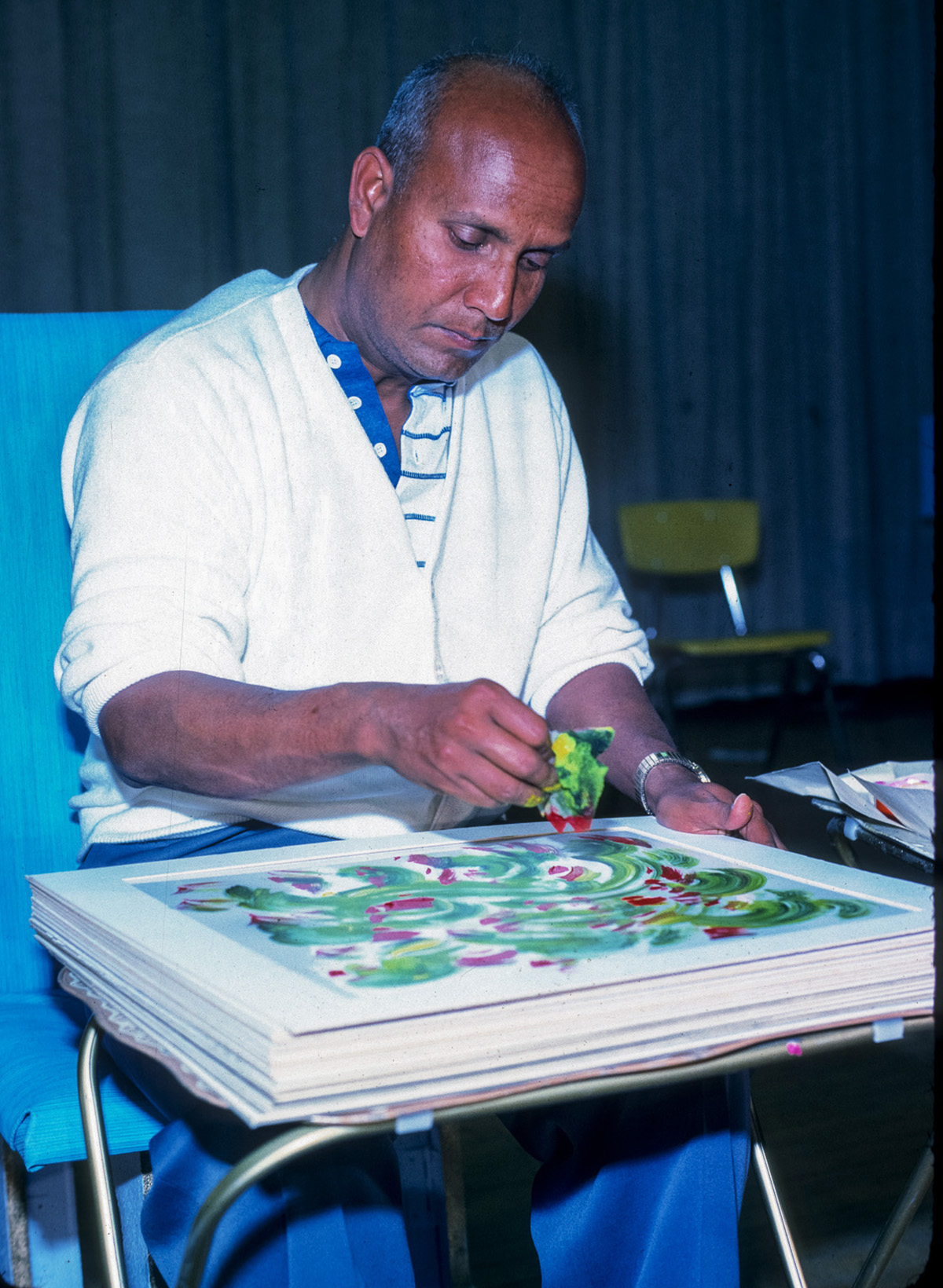 1977 Photo by Bhashwar Hart Sri Chinmoy painting at his Jharna-Kala gallery in Grand Central Station, New York.
