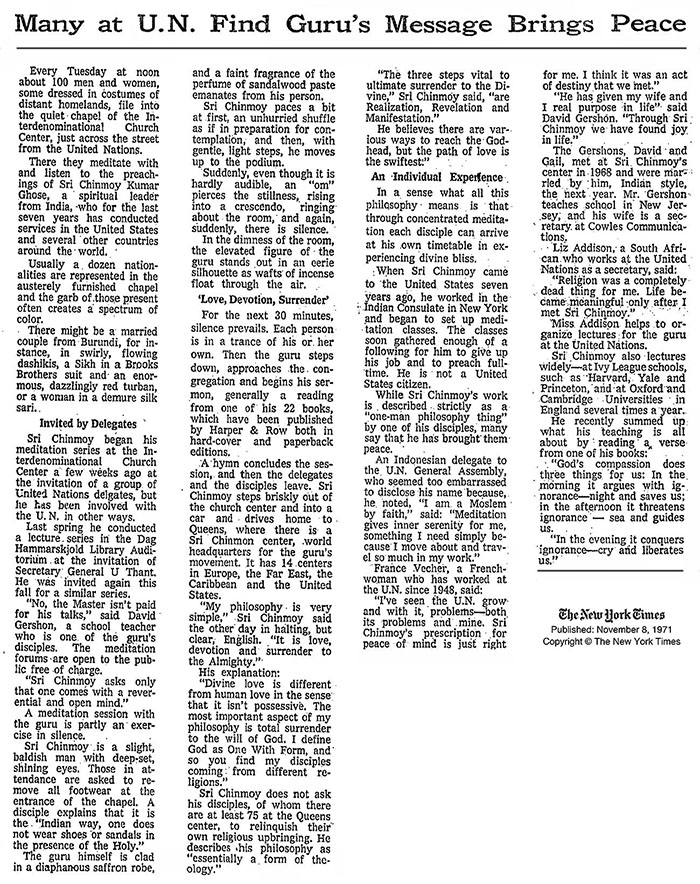 “I’ve seen the U.N. grow, and with it, problems — both its problems and mine. Sri Chinmoy’s prescription for peace of mind is just right for me. I think it was an act of destiny that we met.”