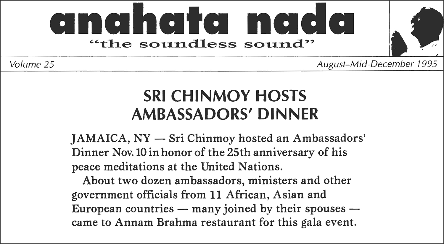 JAMAICA, NY — Sri Chinmoy hosted an Ambassadors' Dinner Nov. 10 in honor of the 25th anniversary of his peace meditations at the United Nations.