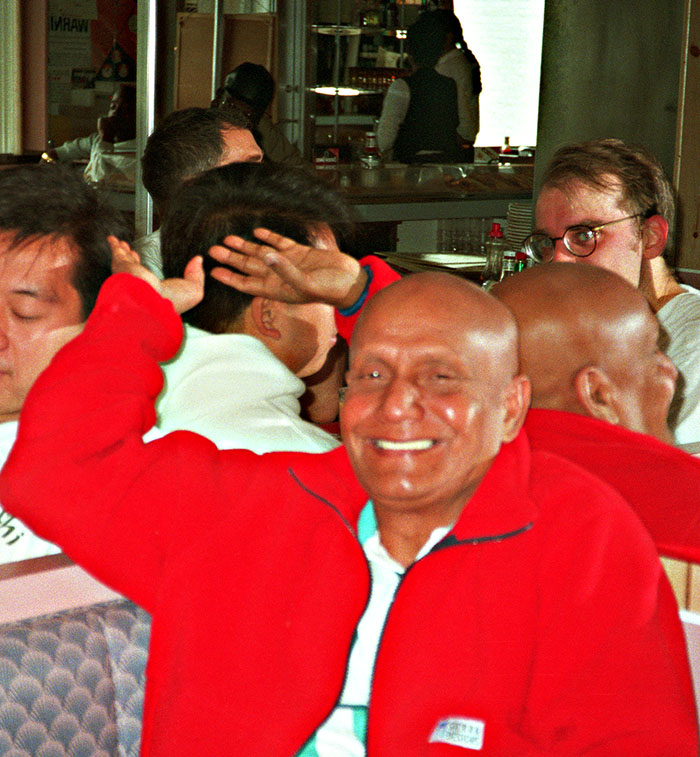 Sri Chinmoy, eating out with the boys at a New York diner.