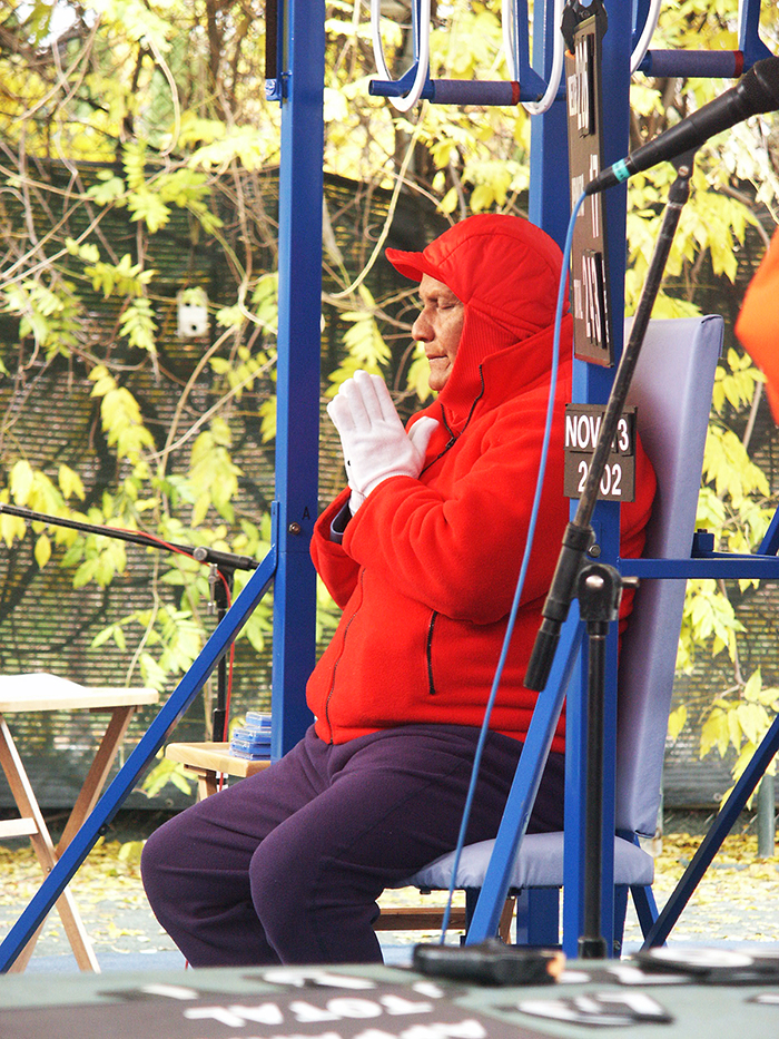Sri Chinmoy meditates before beginning his ‘Lifting Up the World with a Oneness-Heart’ programme at Aspiration-Ground in New York, during which he lifts surfer-singer Jack Johnson, who dedicates one of his songs to Sri Chinmoy at his Roseland concert that evening.