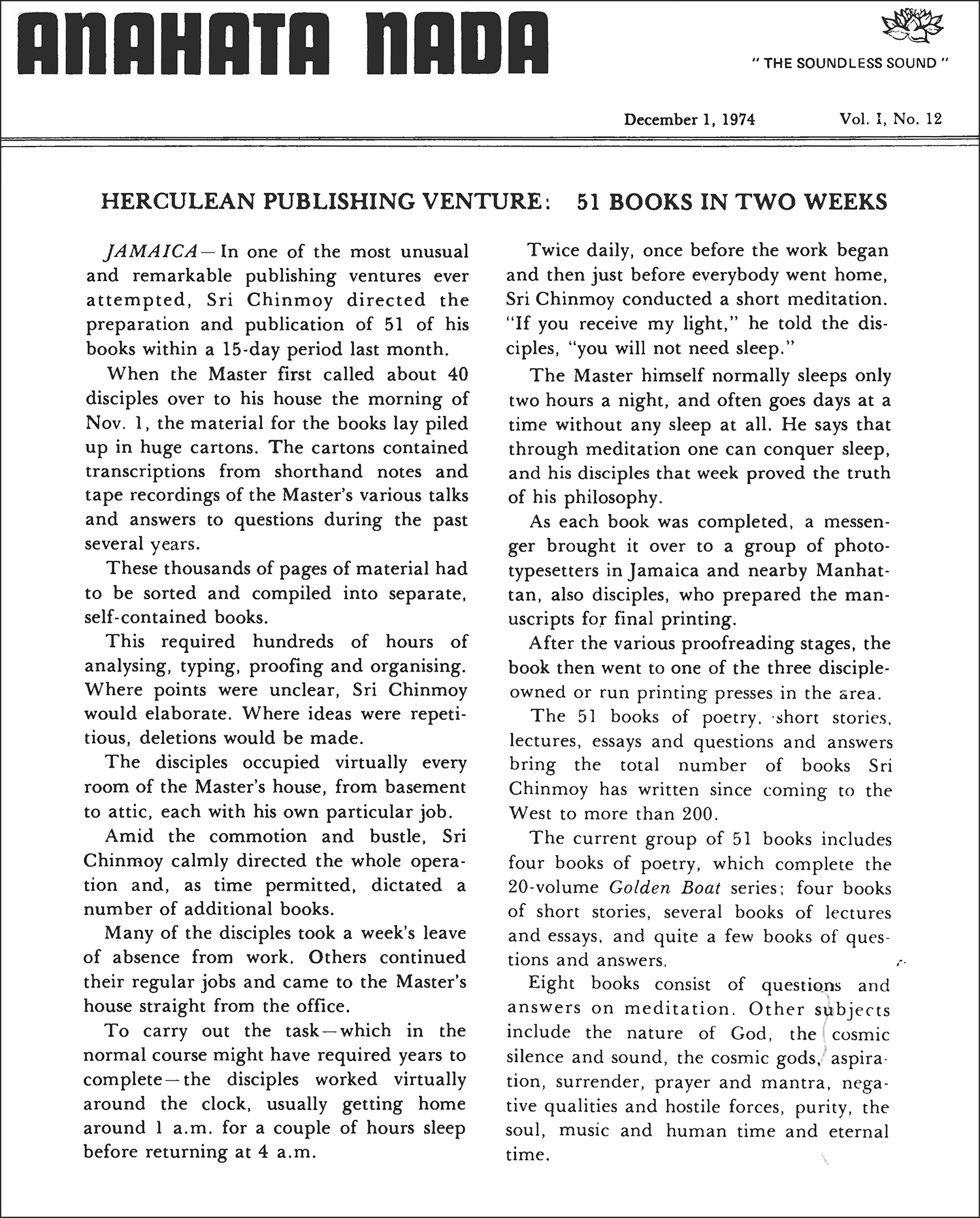 Published in Anahata Nada, December 1, 1974, Vol. I, No. 12