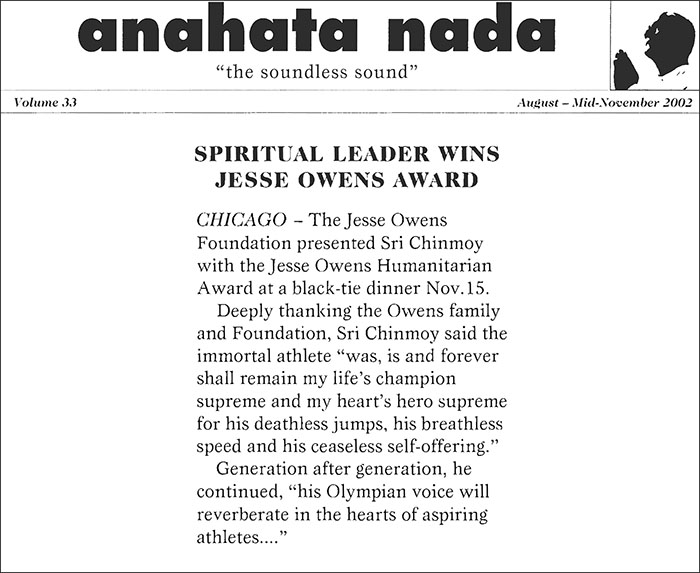 CHICAGO — The Jesse Owens Foundation presented Sri Chinmoy with the Jesse Owens Humanitarian Award at a black-tie dinner Nov.15.