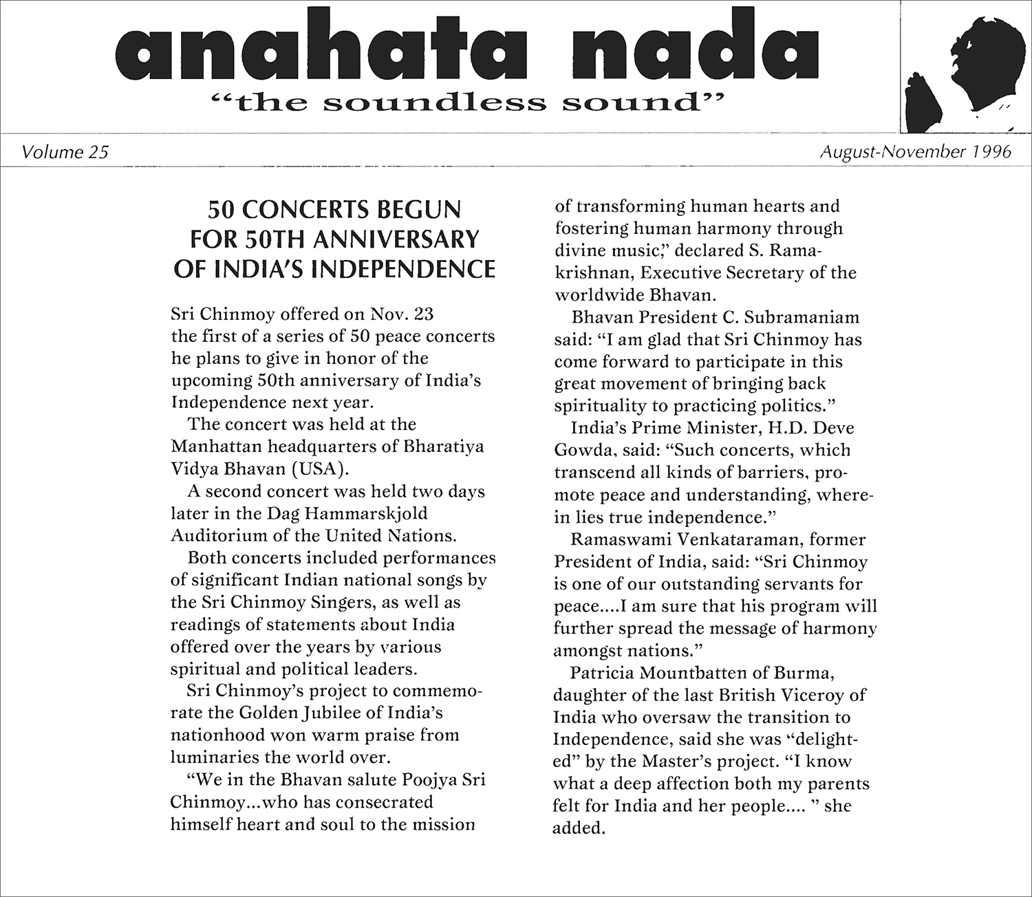 Sri Chinmoy offered on Nov. 23 the first of a series of 50 peace concerts he plans to give in honor of the upcoming 50th anniversary of India’s Independence next year.
