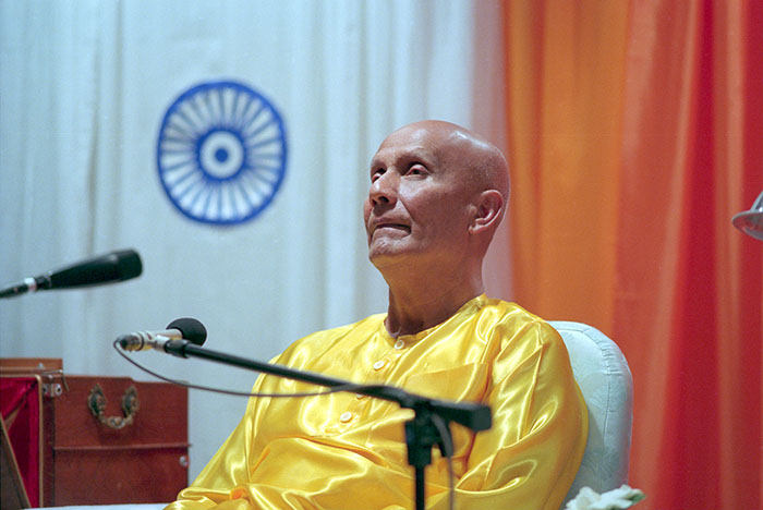 Sri Chinmoy meditates at the first of his 50 Peace Concerts he offers in honour of the 50th Anniversary of India’s Independence. Behind him, the tricolour Indian flag hangs vertically — at its centre, is the 24-spoked blue wheel of the Ashoka Chakra.