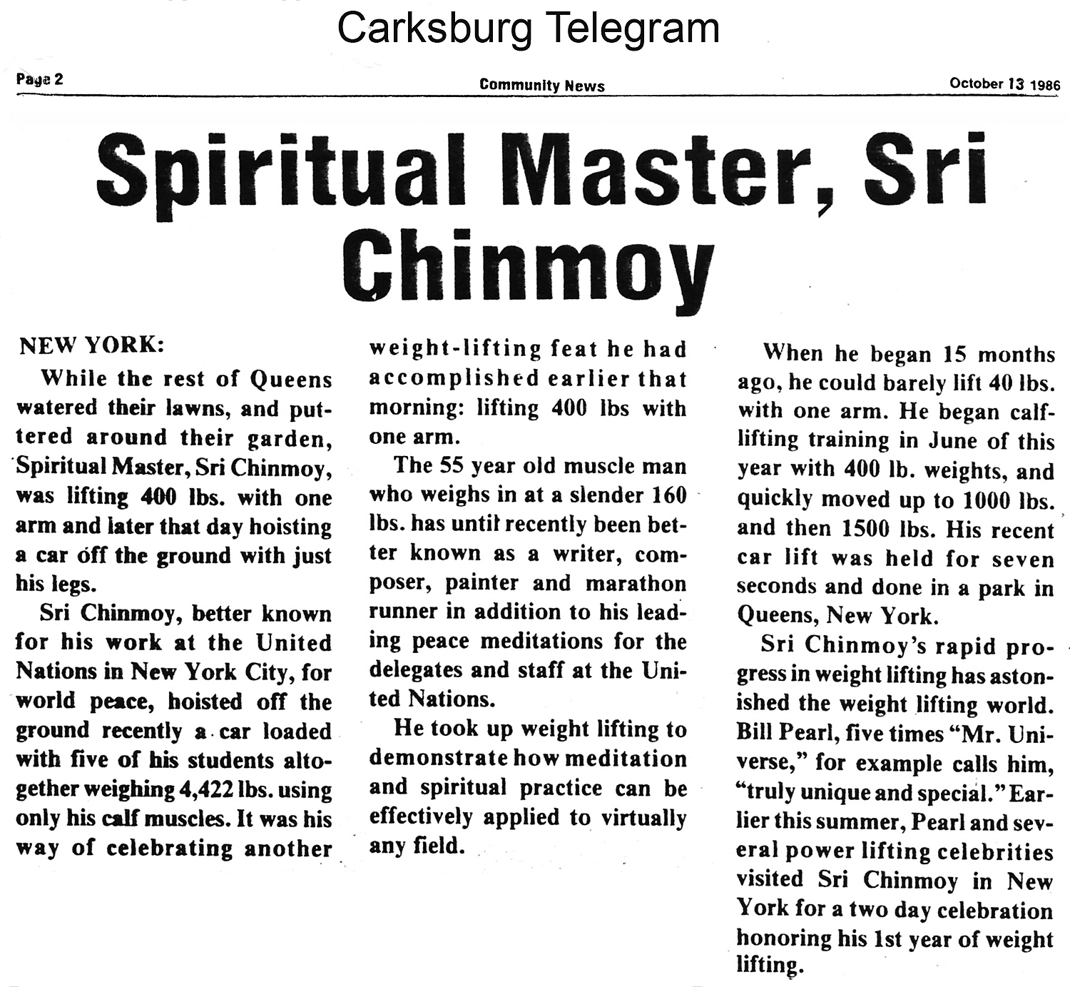 While the rest of Queens watered their lawns, and puttered around their garden, spiritual Master, Sri Chinmoy, was lifting 400 lbs. with one arm and later that day hoisting a car off the ground with just his legs.Sri Chinmoy, better known for his work at the United Nations in New York City, for world peace, hoisted off the ground recently a car loaded with five of his students altogether weighing 4,422 lbs. using only his calf muscles. It was his way of celebrating another weight-lifting feat he had accomplished earlier that morning: lifting 400 lbs with one arm.