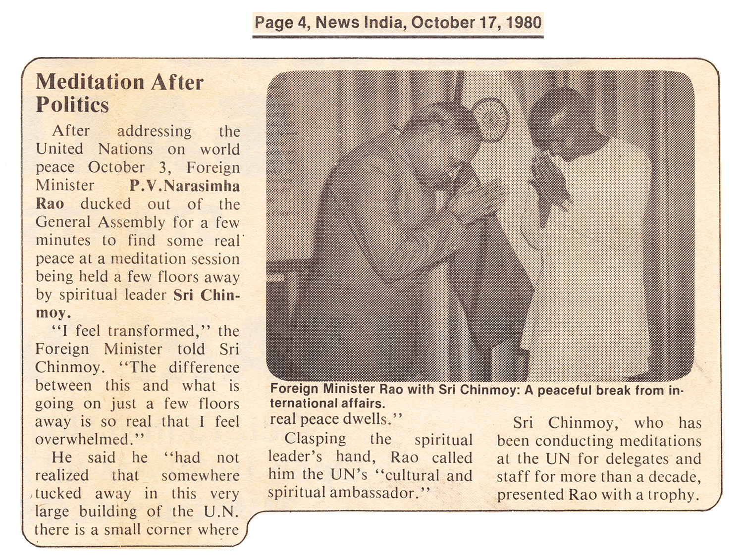 Sri Chinmoy, who has been conducting meditations at the UN for delegates and staff for more than a decade, presented Rao with a trophy.