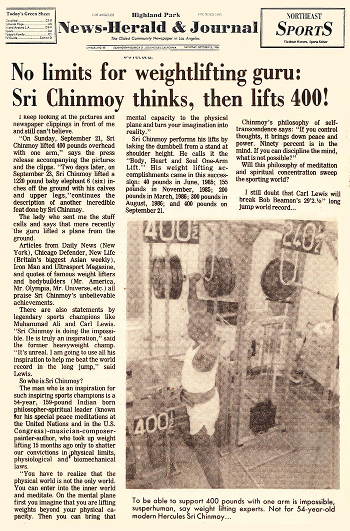 Articles from Daily News (New York), Chicago Defender, New Life (Britain’s biggest Asian weekly), Iron Man and Ultrasport Magazine, and quotes of famous weight lifters and bodybuilders (Mr. America, Mr. Olympia, Mr. Universe, etc.) all praise Sri Chinmoy’s unbelievable achievements.