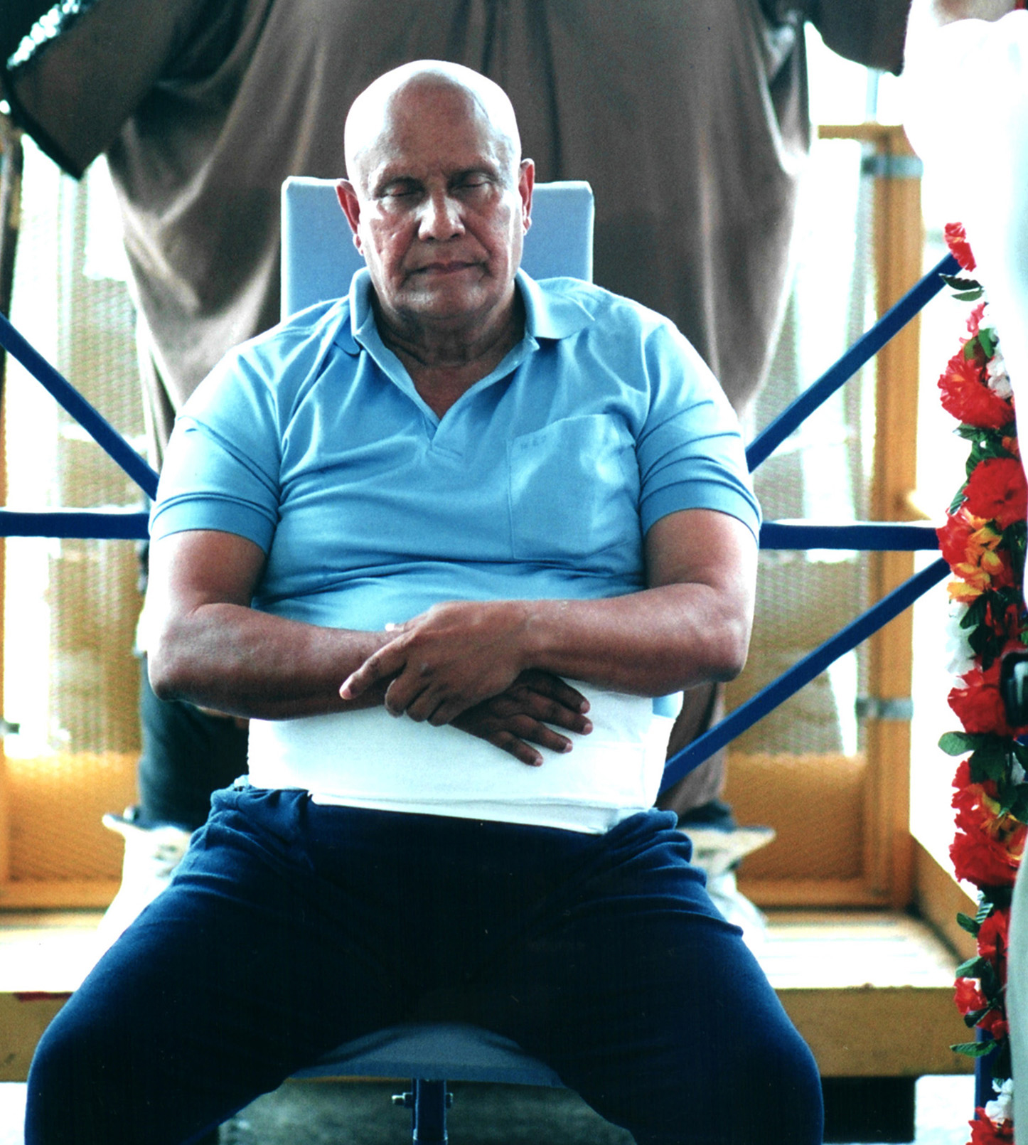 2004 Sri Chinmoy meditates before lifting 735-pound Larry McConneghey into the air in a two-arm seated lift at Lookout Point in Riverside Park, upper Manhattan, New York. This is Sri Chinmoy’s heaviest one-person lift.